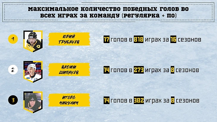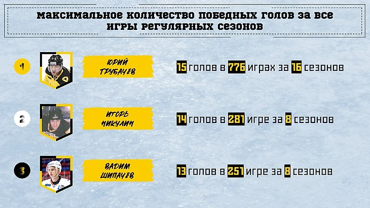 По суммарному количеству победных голов в регулярных сезонах лидер – Юрий Трубачев. За счет гигантского отрыва в количестве матчей он опередил Никулина и Шипачева.