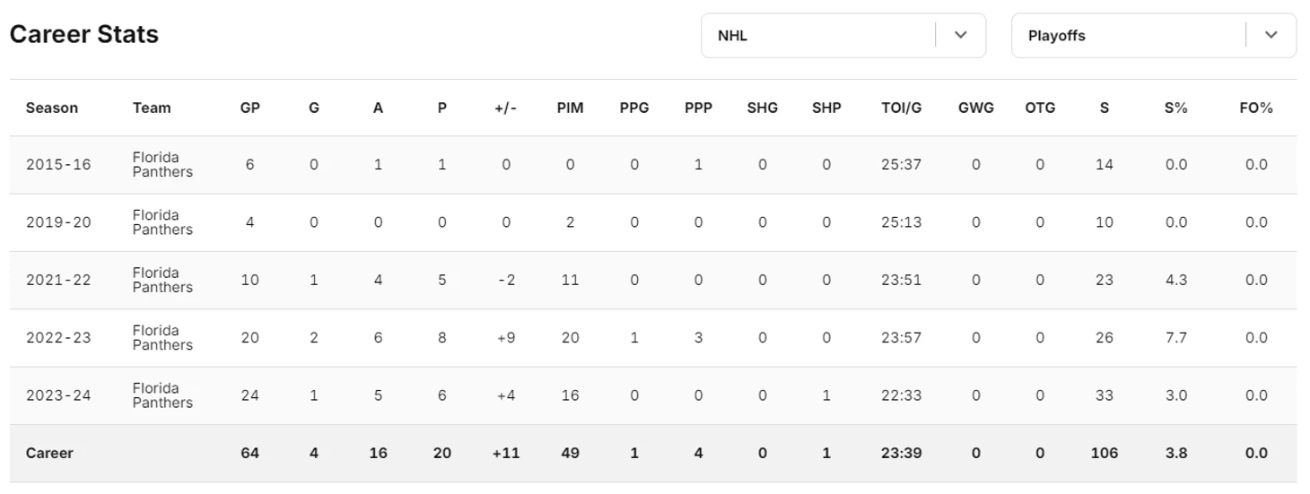 Среди лучших игроков-бомбардиров «Флориды Пантерз», Экблад занимает 6-ую строчку, среди защитников 1-ую (смотрите фото выше). Ознакомимся со статистикой регулярных чемпионатов и плей-офф.