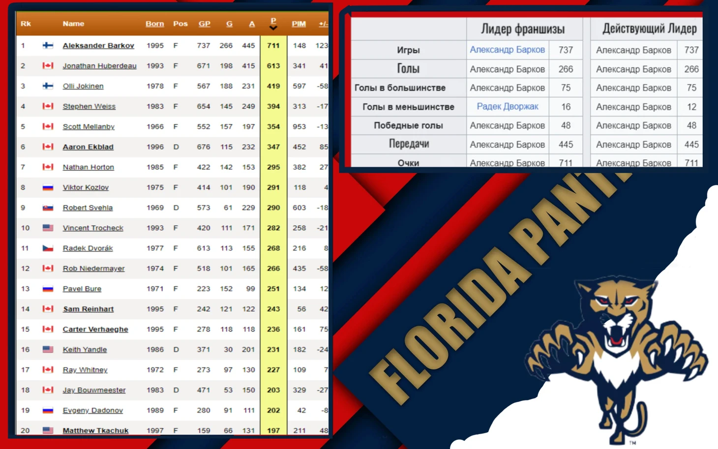 На драфте 2013 года, «Флорида Пантерз» выбирает под общим 2-ым номером финна с русскими корнями – Александра Баркова (уступив по праву 1-ый номер Натану Маккиннону). Финн привлек свое внимание менеджмента Флориды, после прорывного сезона 2012/2013, набрав в 58 играх 52 очка (21 шайба, 31 передача), в высшей лиге Финляндии, за команду «Таппара» из города Тампере. Через пять лет после драфта, в 2018 году, Александр становится капитаном команды, унаследовав повязку от Дерека Маккензи, а еще через пять лет, в 2023 году, капитан «Пантерз» становится лучшим бомбардиром за всю историю франшизы.