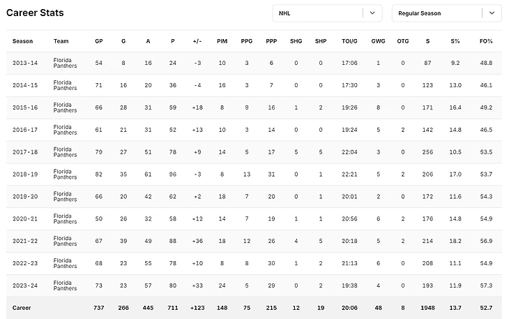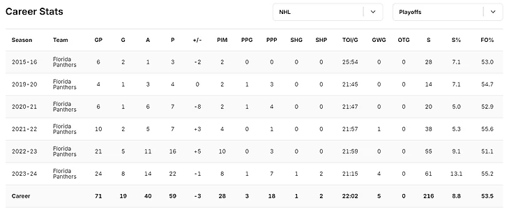 Александр Барков – двусторонний центральный нападающий с внушительными габаритами (191см, 96кг), одинаково хорошо играющий на обеих сторонах площадки. Результат не заставил себя долго ждать и центрфорварда Флориды находят две награды «Селке Трофи» – трофей, вручаемый лучшему нападающему оборонительного плана (2021, 2024). Так же из личных наград у Александра, «Леди Бинг Трофи» 2019 года – трофей, ежегодно присуждаемый игроку, показавшему образец честной спортивной борьбы и джентльменского поведения в сочетании с высоким игровым мастерством. Ознакомимся со статистикой по сезонам и статистикой плей-офф.