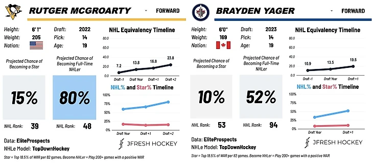 По мнению предиктивных моделей для проспектов у Брэйдена такие же шансы закрепиться в НХЛ, как и у Рутгера год назад, а по приведенной к общему знаменателю, в зависимости от уровня лиги, результативности Ягер его даже немного опережает: 19,5 очков против 16,8.