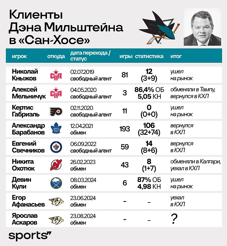Судя по всему, у Мильштейна довольно теплые отношения с руководством «Шаркс» – вот некоторые из его хоккеистов, которые в последние годы оказывались в клубе. И это только если не считать тех клиентов, кто изначально был задрафтован «акулами».