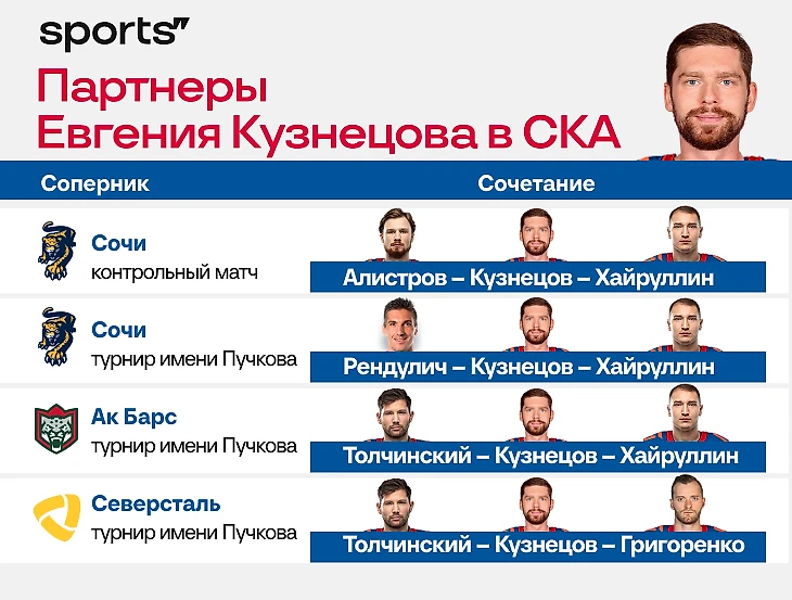 Так происходит и с Кузнецовым. Он появляется в большинстве и проводит много времени с разными партнерами. На сборах в СКА вместе наигрывались Кузнецов и Марат Хайруллин. В матче с «Северсталью» Ротенберг разбил и эту связку. Если учитывать встречу против «Сочи» на сборах, то тройка Евгения даже менялась четыре раза из четырех. С кем же он в итоге начнет сезон?
