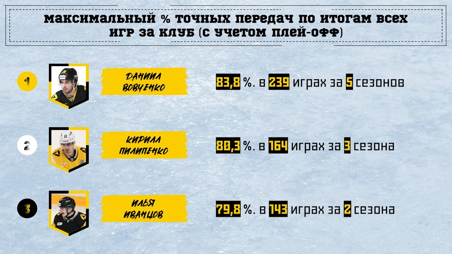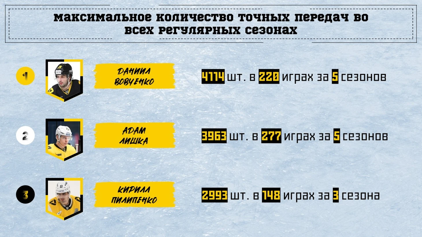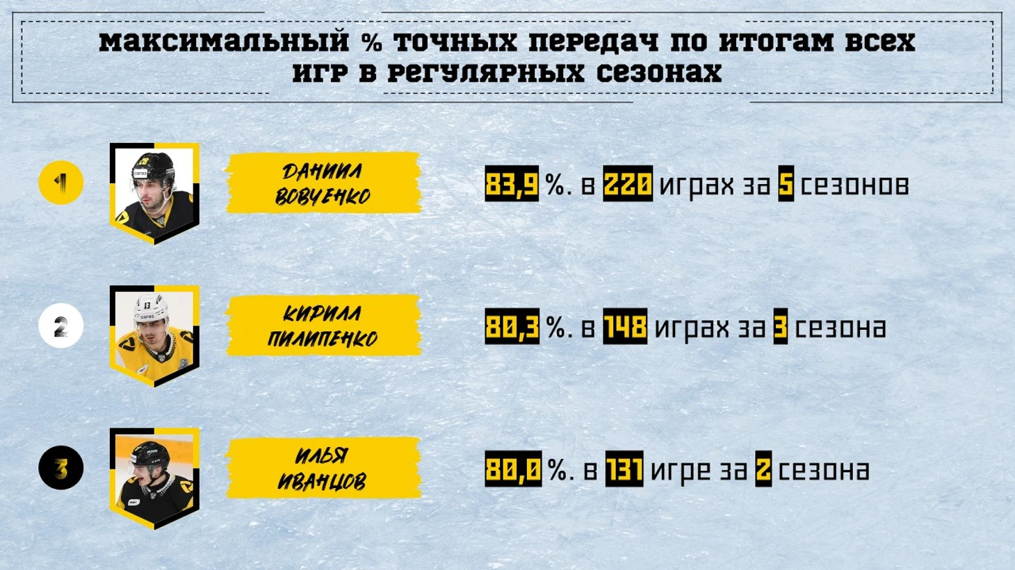 По сумме всех регулярных сезонов лидерство Вовченко в точности передач только усилилось. На третьем месте неожиданно появился Иванцов.