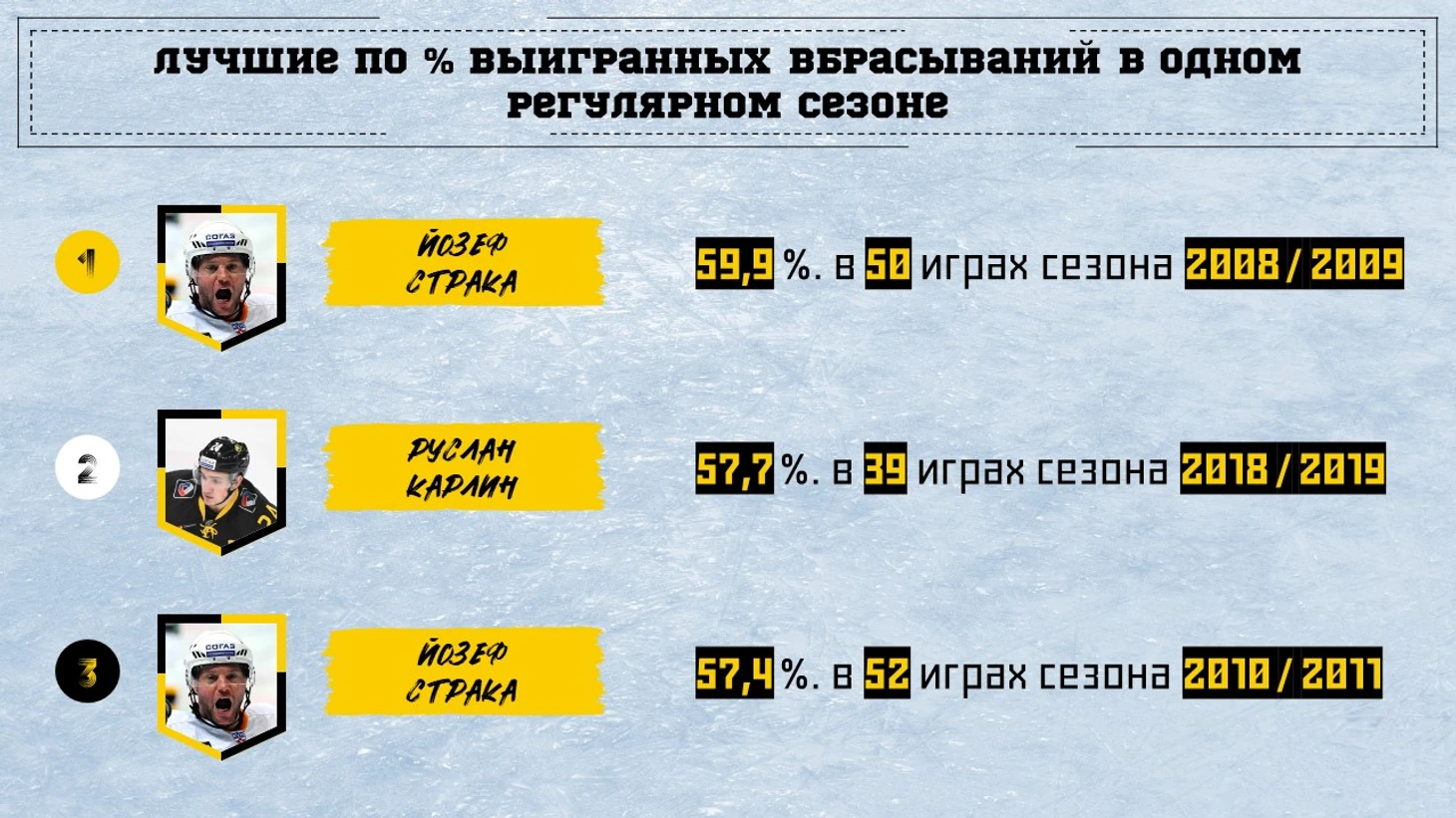 По успешности игр на вбрасываниях центры Северстали не часто выгодно отличались от игроков других клубов, но все же иногда у нас попадались стабильные лидеры. Йозеф Страка был вне конкуренции в регулярках.