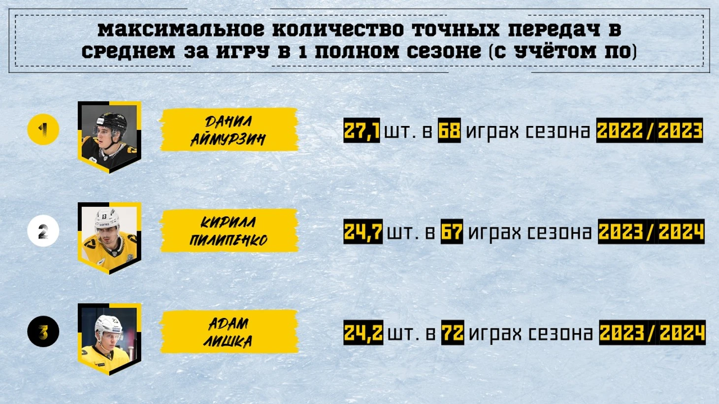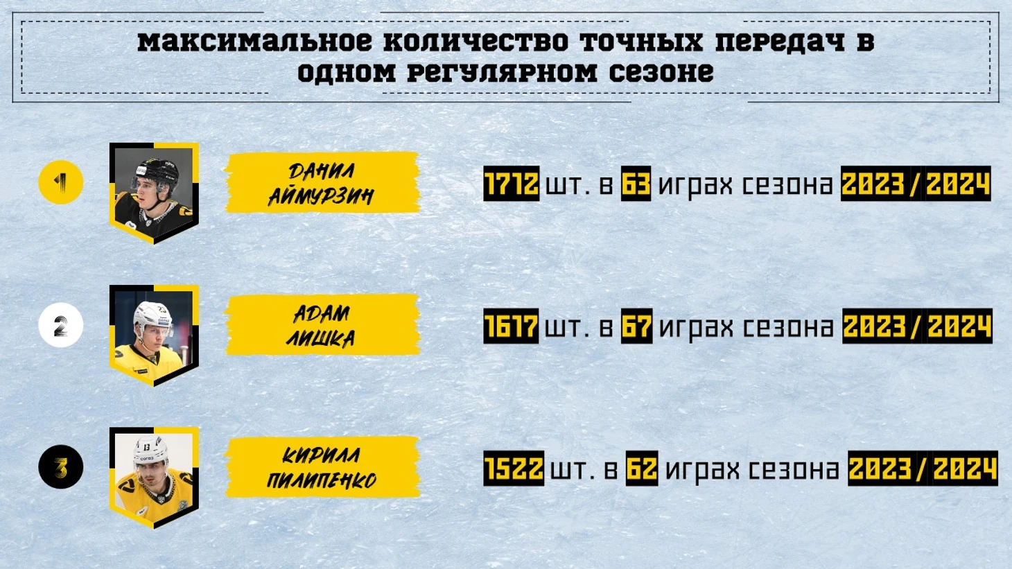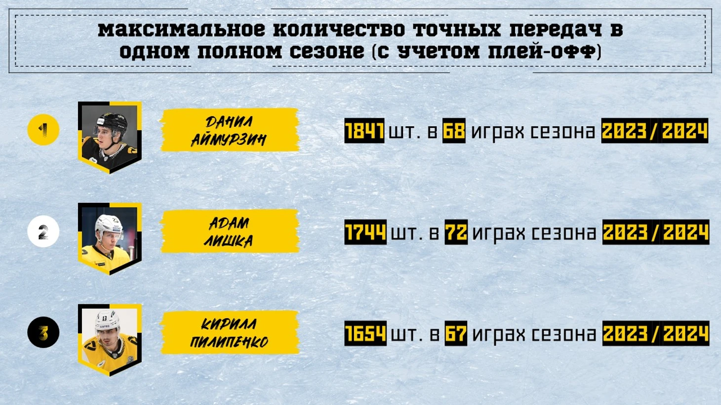 Итак, по количеству передач за сезон лидирует, как и подобает центрфорварду, Данил Аймурзин.