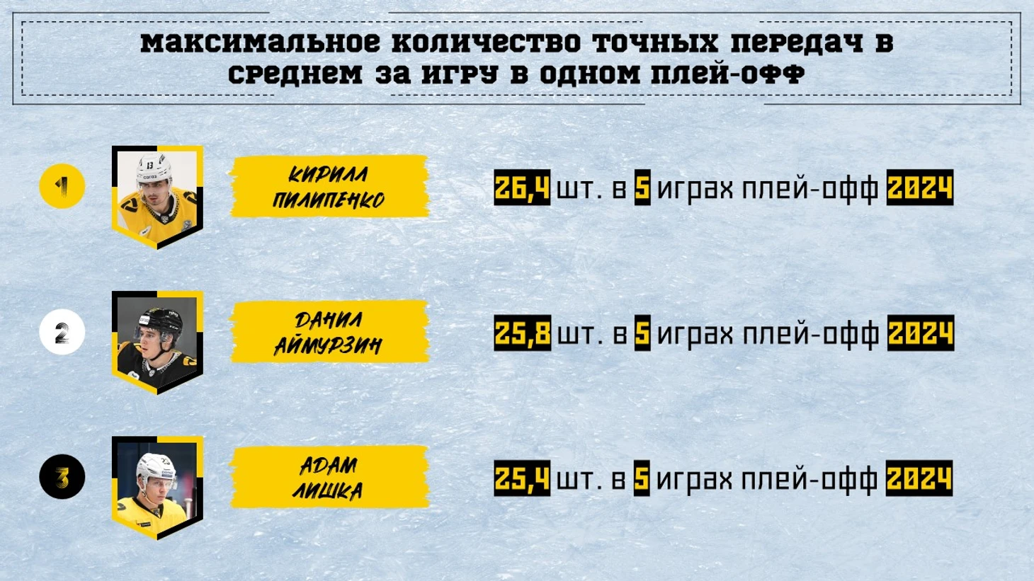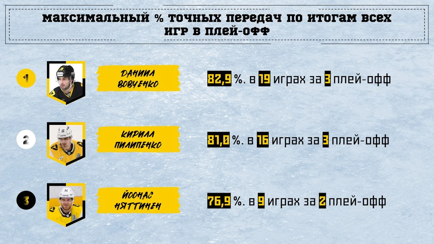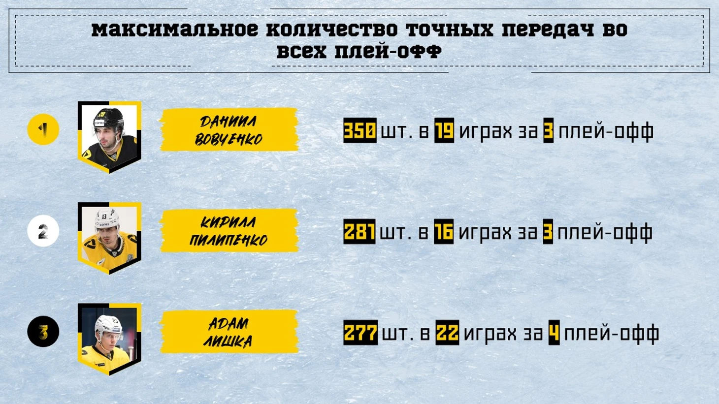 По количеству передач за плей-офф ожидаемый лидер Вовченко. Пилипенко и Лишка не критично отстают и за 1-2 сезона могут обогнать Даниила.