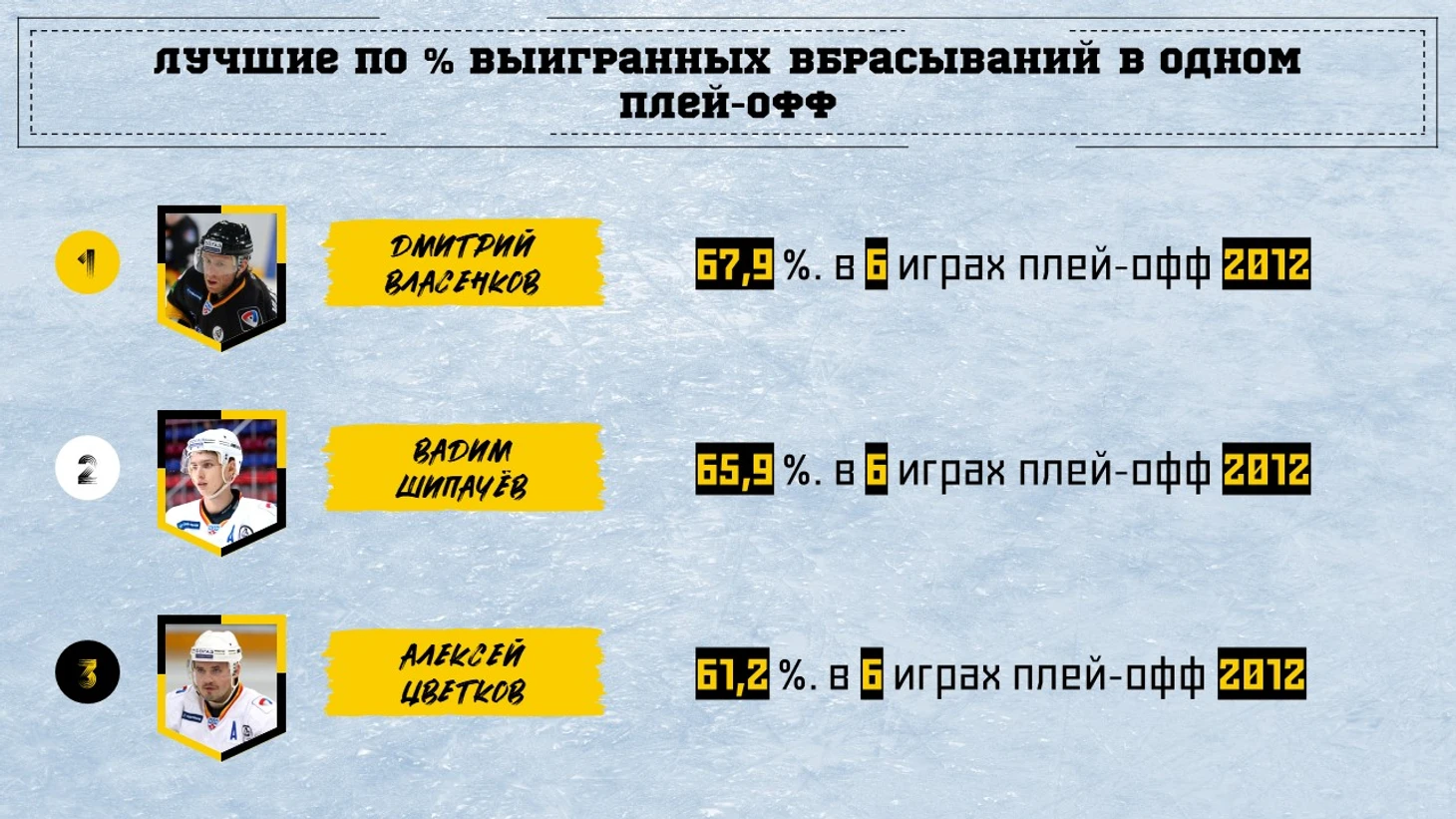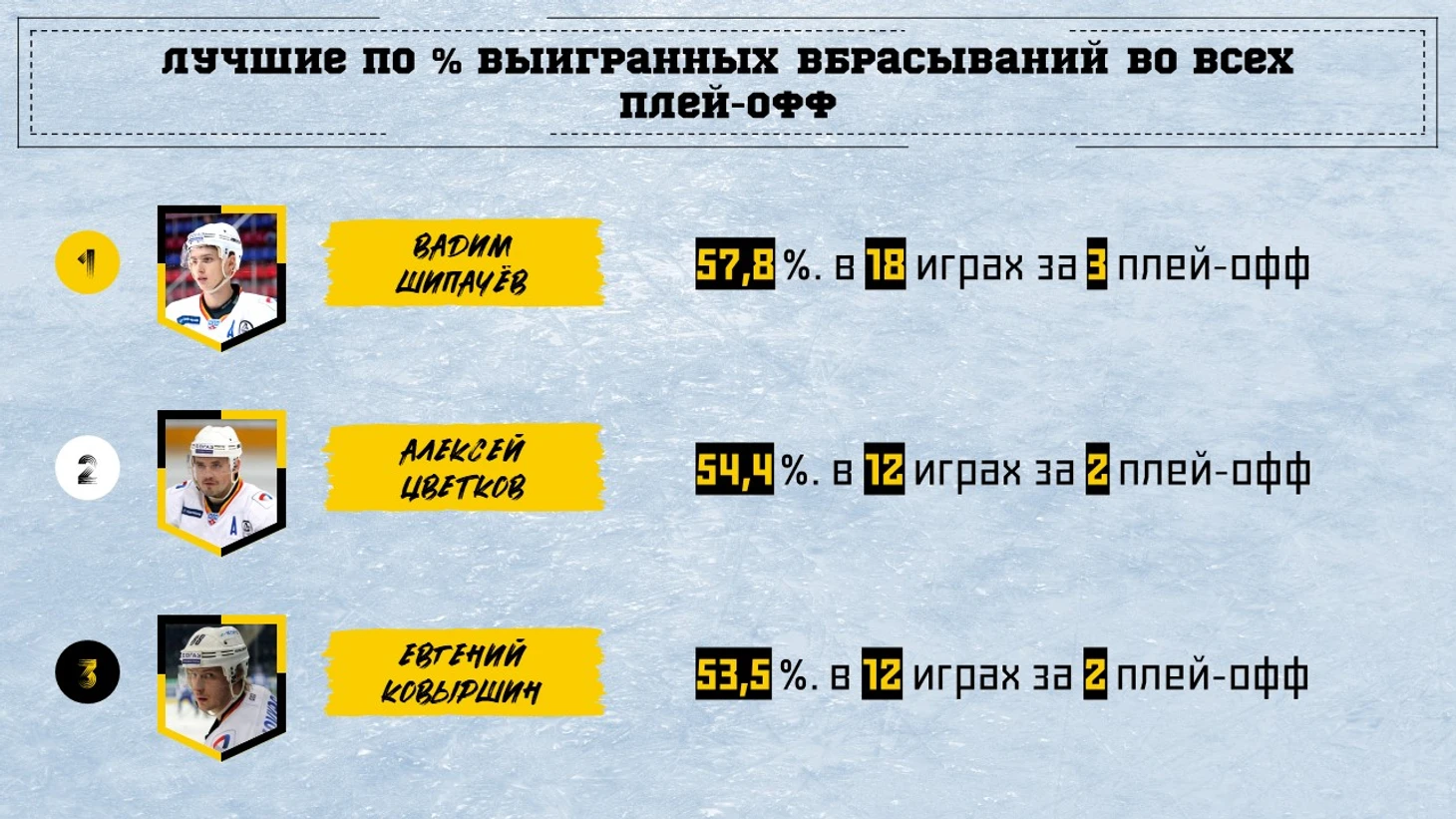 В плей-офф все менее очевидно – тут на первом месте, причем с хорошими показателями оказался Вадим Шипачев, которого регулярно упрекали в плохой игре «на точке».