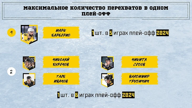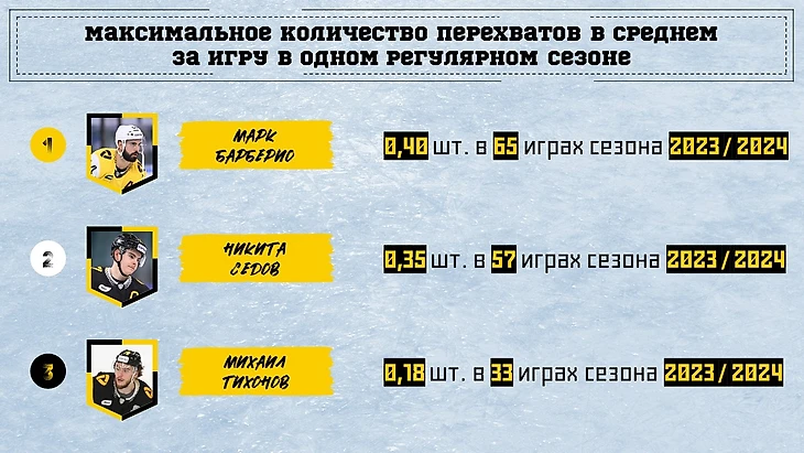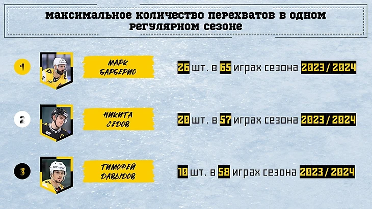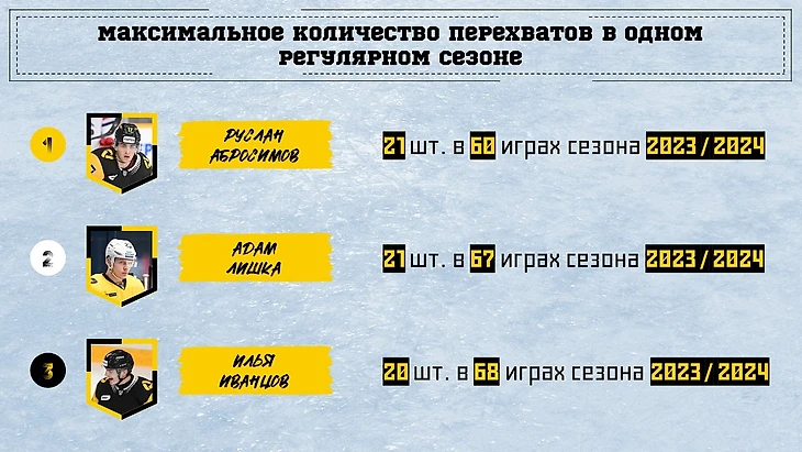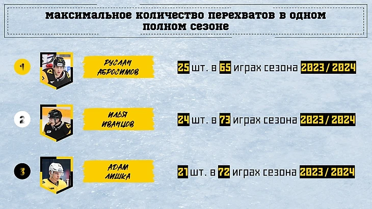 В перехватах есть только игроки предыдущего сезона. Тут лидером (за счет меньшего числа матчей) стал Руслан Абросимов.