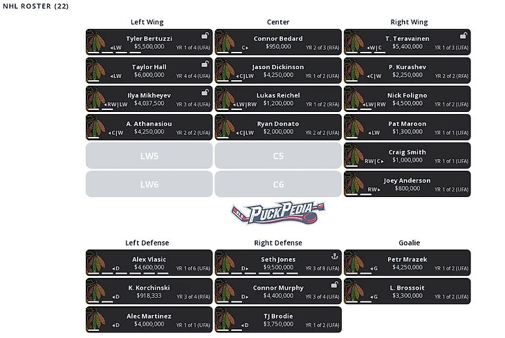 27) «Чикаго Блэкхоукс». «Ястребы» явно могут быть довольны первым сезоном своей молодой звезды Коннора Бедарда, выигравшим Колдер Трофи. Летом генеральный менеджер Кайл Дэвидсон был крайне активен на рынке свободных агентов, взяв в обойму команды Тайлера Бертуцци, Теуво Терявяйнена, Пэта Маруна, Ти Джей Броди, Алека Мартинеса и Лорана Броссуа. Также через обмен с «Кэнакс» были получены права на Илью Михеева. Довольно плодотворным получился для «Блэкхоукс» Драфт 2024 года, в ходе которого ключевым выбором стал защитник Артем Левшунов. Также была значительно пополнена группа проспектов нападения в лице Буавера, Ванакера, Мастарда, Спеллачи, Придхама. Учитывая такие впечатляющие преобразования состава, был минутный порыв поставить «ястребов» в четвертую группу команд, однако все-таки по итогу принято решение несколько поубавить пыл. Ведь по сути «Блэкхоукс» еще не вышли из перестройки и выбор в топ-10 на довольно сильном Драфте 2025 года им явно не будет лишним на данном этапе развития клуба.