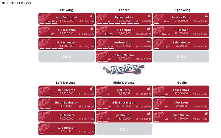 21) «Детройт Ред Уингз». В прошлом сезоне так круто бились за попадание в плей-офф через Уайлд-кард, что было даже обидно, что у них этого не получилось. В определенный ступор вводят действия (точнее бездействие) Стива Айзермана на дедлайне, никак не усилившим команду. Этим летом ключевыми задачами руководства стали переподписания молодых лидеров Морица Зайдера и Лукаса Рэймонда, которых скорее всего постараются подписать на длительный срок. Тенденция по контрактам молодых игроков позволяет рассчитывать что там суммы будут в диапазоне от 7,5 до 8,5 млн долларов. Ключевыми приобретениями стали возрастной голкипер Кэм Тальбо, который скорее всего и станет первым номером команды, имеющей большие проблемы с вратарской позицией в последних сезонах, а также нападающий средних звеньев Владимир Тарасенко, удачно заскочивший к «Пантерз» на дедлайне. Кроме того, удалось переподписать на сезон неплохо зашедшего Патрика Кейна. Что точно вызывает большие опасения и не позволило поставить «красные крылья» чуть повыше, это линия обороны, которая состоит либо из довольно возрастных и при этом деградирующих защитников, либо из перспективных, но еще не совсем зрелых хоккеистов вроде того же Зайдера и 21-летнего шведа Эдвиндссона.