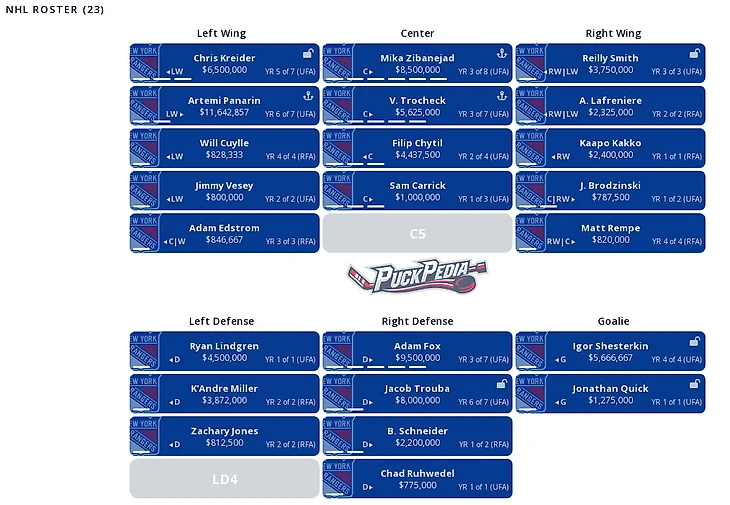 1) «Нью-Йорк Рейнджерс». На данный момент «рейнджеры» выглядят самой сильной командой Востока с определенным гандикапом и главным фаворитом на победу в Кубке Стэнли следующего года. У них есть практически все для победы – элитный вратарь, элитный защитник, хорошее топ-6, неплохая глубина и главный тренер с победным опытом. Позиция автора состоит в том, что в целом в грядущем сезоне существует ровно две команды, которые сейчас находятся на пике своего развития в нынешнем цикле – «Рейнджерс» и «Ойлерз». После этого сезона NYR необходимо будет продлевать целую группу хоккеистов, включая Алексиса Лафренье, Райана Линдгрена, К'Андре Миллера и, самое главное, Игоря Шестеркина, который по слухам будет запрашивать порядка 13 млн долларов. Чемпионское окно стремительно закрывается.