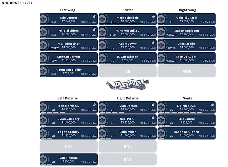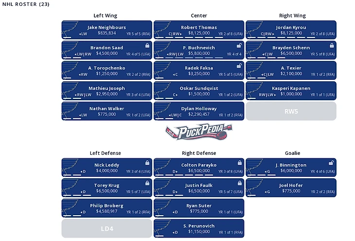 22) «Сент-Луис Блюз». «Музыканты» добавили драйва последним дням лета, сделав оффершиты игрокам «Ойлерз» Холлоуэю и Бробергу. И в итоге «нефтяники» не смогли повторить условия соглашений, отпустив игроков в Центральный дивизион. Армстронг (генеральный менеджер «Блюз») даже пытался несколько сгладить накалившиеся отношения с руководством финалиста прошедшего Кубка Стэнли, отдав бесплатно проспекта Пола Фишера и выбор в третьем раунде Драфта 2028 года. Можно по разному относиться к действиям генерального менеджера команды, тем не менее ему удалось прибавить к уже имеющейся группе хоккеистов молодого защитника, созревшего для игры на уровне НХЛ, и молодого игрока в глубину атаки. Из других летних приобретений можно отметить нападающего Матье Жозефа и ветерана-защитника Райана Сутера, для которого грядущий сезон станет 20 в НХЛ. В целом состав можно даже назвать боевым и при успешной тренерской работе Дрю Баннистера «музыканты» вполне могут быть опасны для соперников. Однако на данный момент кажется, что им не хватает мощи на синей линии и глубины атаки для попадания в плей-офф. Плюс может оказать негативное воздействие нервозность голкипера Джордана Биннингтона.