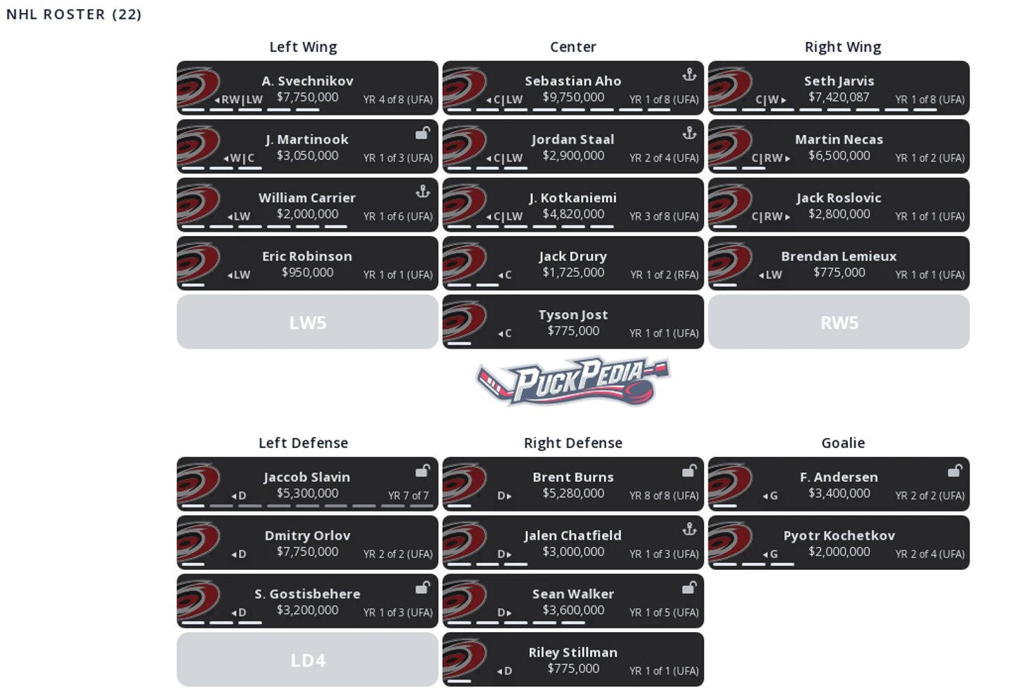 15) Возможно, многие удивятся положению «Каролины Харрикейнз» в моем рейтинге, однако в то время, как «Сиэтл Кракен» является главной темной лошадкой сезона, согласно авторской позиции, «ураганы» являются главными претендентами на провал. Серьезных подвижек в прошлых сезонах сделано не было относительно успехов на уровне плей-офф, хотя «Харрикейнз» неизменно считались одним из главных фаворитов на Кубок Стэнли. А сейчас к этим не в полной мере оправдавшимся ожиданиям добавилось ослабление состава. Летом ушли защитники Шей и Пеши, нападающие Генцел, Терявяйнен, Ноусен и Кузнецов. Согласитесь, список довольно солидный. Вместо них добавлены были Шон Уокер, Шейн Гостисбер, Джек Рословик, Уильям Каррье и Тайсон Джост. Неравнозначная замена, прямо скажем. Плюс не молодеют Джордан Стаал и Брент Бернс. Перспективы относительно следующего сезона выглядят довольно туманными. Единственный позитивный момент от межсезонья – удалось переподписать Мартина Нечаса и Сета Джарвиса.