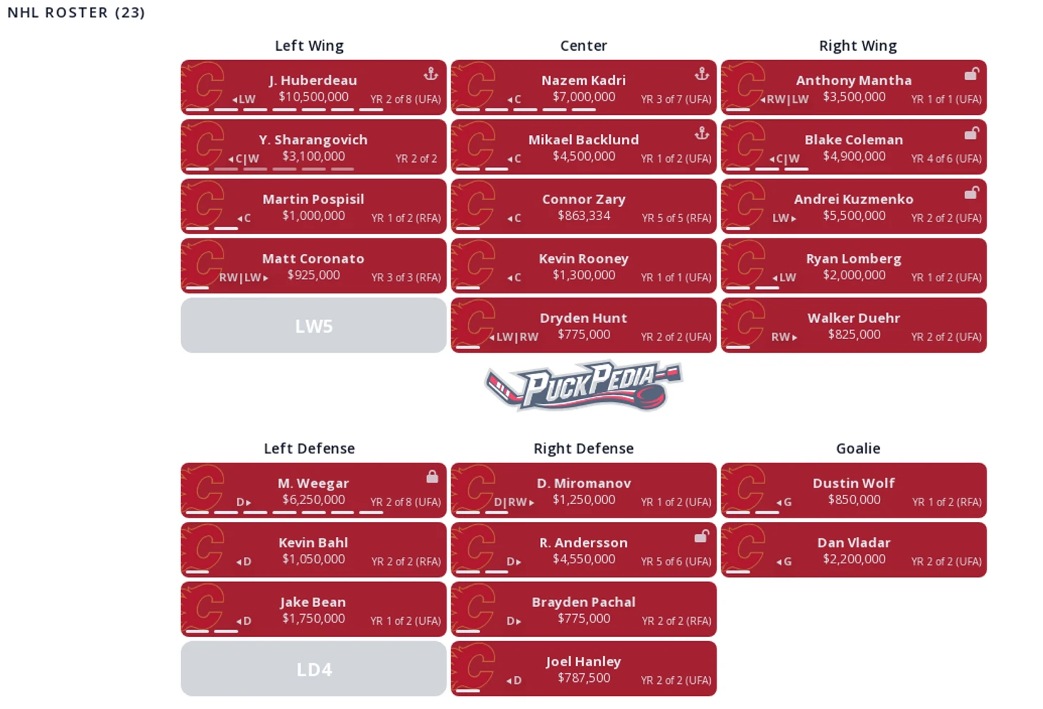 26) «Калгари Флэймз». После яркой регулярки сезона 2021/2022 «огоньки» довольно быстро дошли до ребилда и сейчас уже скорее рассматриваются в качестве команды-претендента на высокий пик, нежели в качестве претендента на попадание в плей-офф. Летом удалось заключить новое соглашение с удачно зашедшим белорусским нападающим Егором Шаранговичем на пять лет, а также подписать на рынке свободных агентов Энтони Манту и действующего обладателя Кубка Стэнли Райана Ломберга. Плюс в основе проведет сезон один из самых многообещающих молодых голкиперов Дастин Вульф, которого я рассматриваю в качестве теневого фаворита на звание лучшему новичку сезона. Из заметных потерь можно назвать защитника Оливера Шилингтона, ушедшего в «Эвеланш». Также ходят слухи о том, что руководство клуба готов рассмотреть предложения по обмену Джонатана Юбердо, захандрившего в канадском клубе после обмена из «Пантерз». В целом особых ожиданий от «огоньков» нет, им, возможно, лучше бы попробовать пойти за Хагенсами, Мартоне, Рябкиными и прочими. На Драфте этого года они довольно неплохо проявили себя, взяв защитников Зейна Пареха, подобного по стилистике Эрику Карлссону, и Генри Мьюза, который был самым результативным канадским защитником на юниорском ЧМ, нападающих Матвея Гридина, ставшего лучшим бомбардиром USHL, Эндрю Баша и Люка Миса, котрые фигурировали в верхних строчках лучших бомбардиров CHL.