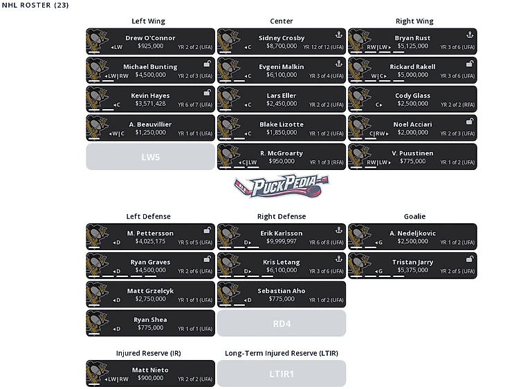 23) «Питтсбург Пингвинз». Одна из самых возрастных команд лиги, которая с составом примерно такого же уровня, что сейчас, не смогла выйти в плей-офф в прошлом сезоне. Пожалуй, самым существенным летним приобретением стал мятежный проспект «Виннипег Джетс» Рутгер МакГроарти, который вполне может рассматриваться в качестве темной лошадки на получение Колдер Трофи в следующем сезоне. В обратном направлении пришлось отдать свое главное молодое дарование, также выбранное на драфте под 14 номером, Брэйдена Ягера. Учитывая то, что «Джетс» в ситуации с МакГроарти фактически был в слабой позиции по отношению к потенциальным партнерам по переговорам, думается мне, что они больше выиграли от этого обмена прямо сейчас, чем «пингвины», которые фактически обменяли одного топ-проспекта на другого топ-проспекта, пускай даже МакГроарти старше, крепче и может уже играть в НХЛ. Другими приобретениями стали нападающие Кевин Хейс, Энтони Бовилье, Блэйк Лизотт, Коди Гласс и защитники Себастьян Ахо, Николай Кныжов и Мэтт Гжельчик. В целом не сказал бы, что сильно впечатляет и кажется, что на данный момент состав не сильно располагает к участию в играх на вылет. Особенно учитывая то, что некоторые лидеры, в частности Малкин и Летанг, уже откровенно сдают позиции. Большой интерес вызывает переподписание Сидни Кросби, у которого после этого сезона истекает контракт.