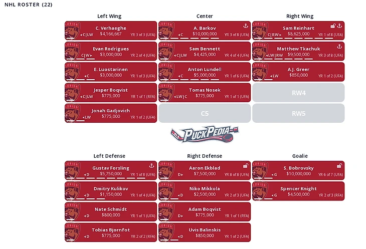 7) «Флорида Пантерз». Действующие чемпионы. Здесь в целом говорить много не надо. Сам статус обязывает им находиться в десятке команд-претендентов на Кубок Стэнли. Однако, на мой взгляд, это не топ-5 ввиду значительно просевшей глубины состава. Лидеров удержать в целом удалось за исключением, пожалуй, игравшего ярко за «пантер» Брэндона Монтура. Однако помимо него ушли также Оливер Экман-Ларссон, Энтони Столарц, Владимир Тарасенко, Райан Ломберг и Кевин Стенлунд. Их усиления не выглядят столь обнадеживающе, как выглядит внушительной группа ушедших игроков. Посмотрим, прервут ли они наметившуюся тенденцию последних двух сезонов, когда действующие чемпионы вылетали в первом же раунде плей-офф.