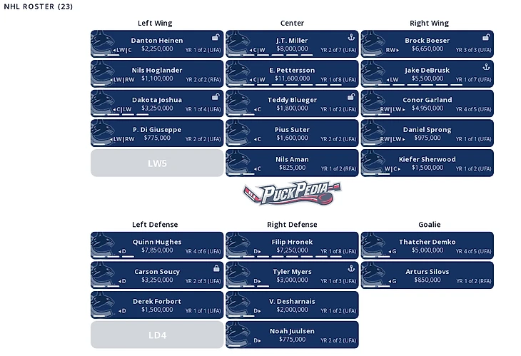 4) «Ванкувер Кэнакс». Есть ощущение, что среди всех команд, ни разу не выигрывавших Кубок Стэнли, «косатки», как никто другой близки к этому. У них есть элитный защитник, взявший в прошлом сезоне Норрис Трофи, в лице умницы Куинна Хьюза и неплохая группа оборонцев, включающая также недооцененного домоседа Карсона Суси, сделавшего прорыв в прошлом сезоне Филипа Хронека и несколько ожившего великана Тайлера Майерса. У них в наличии также два элитных центра в лице Джей Ти Миллера и Элиаса Петтерссона, которому, правда, после получения нового контракта необходимо вернуть свой высочайший уровень продуктивность, стать более стабильным нападающим. Большого прогресса достиг Брок Бэсер, обладающим шикарным броском и тащившим команду в ключевые моменты плей-офф. Летом были сделаны неплохие добавления в атаку в виде бостонского десанта, состоящего из Дэнтона Хайнена и Джейка ДеБраска, а также Даниэля Спронга, неожиданно продешевившим на рынке свободных агентов (975 тысяч долларов на один сезон). У «косаток» в конце концов есть отличная вратарская бригада, которая, правда, вызывает наибольшие опасения из-за травм Демко и Шиловса. Сезон еще не начался, а проблемы уже есть. Посмотрим, оправдает ли ожидания Рик Токкет после прорывного сезона и выведет ли команду еще на уровень выше.
