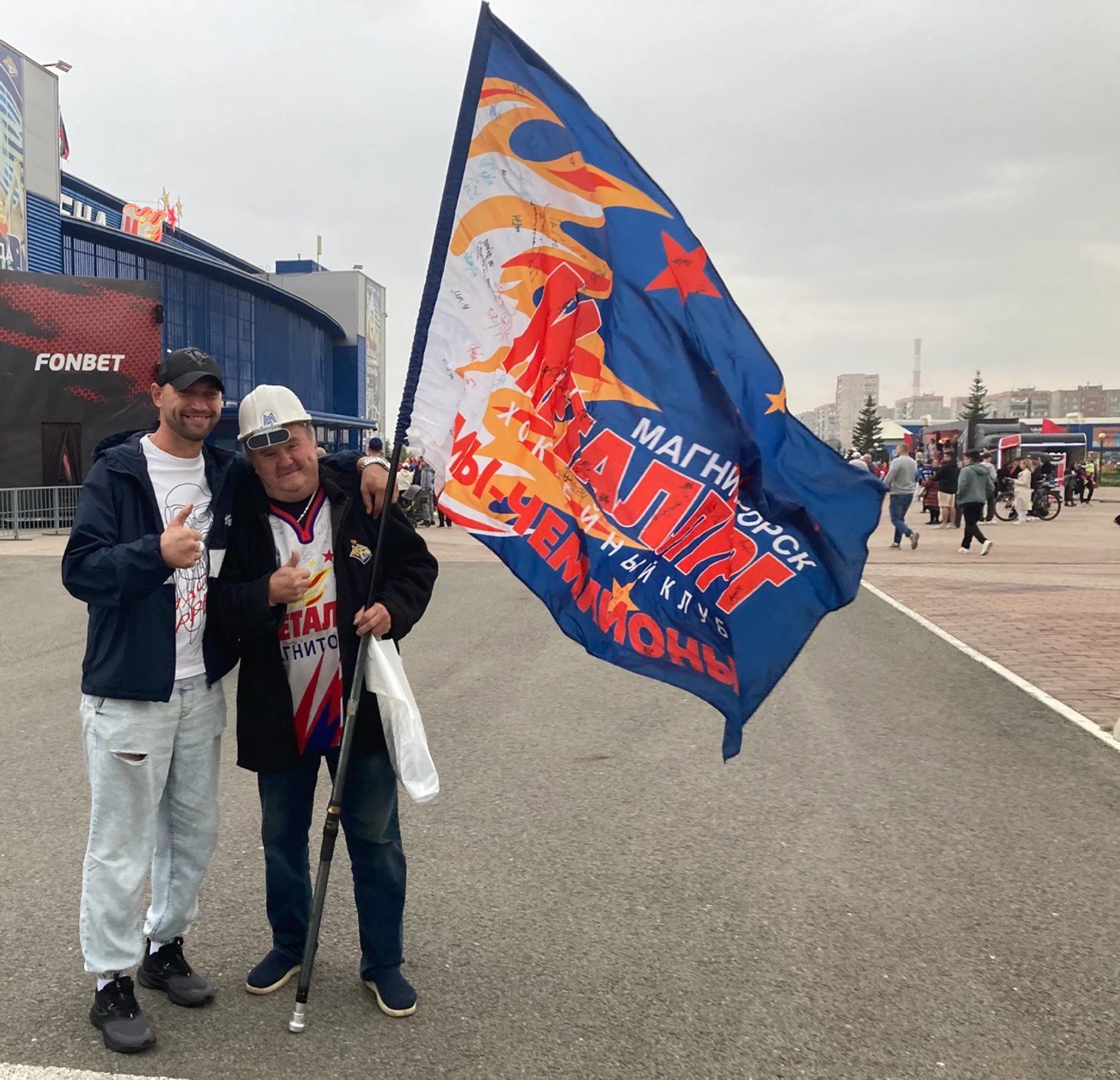 Но самый главный экспонат – живой. С Дядей Васей – он просит называть себя только так – активно фотографируются и общаются, ему жмут руку. Не заметить Дядю Васю невозможно: людей в заводских касках на стадионе хватает, но такой флаг только у него.