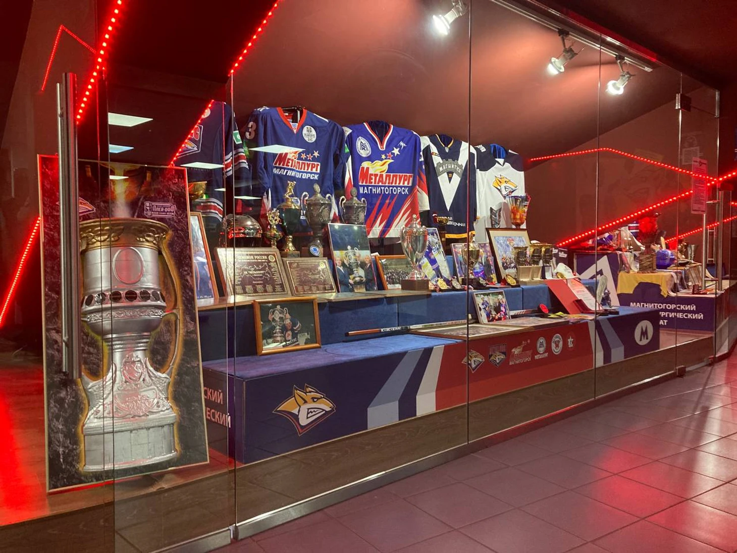 Стильно смотрится и музей магнитогорского хоккея – с десяток ретро-джерси, копия Кубка Гагарина, клюшки и фотографии легенд.