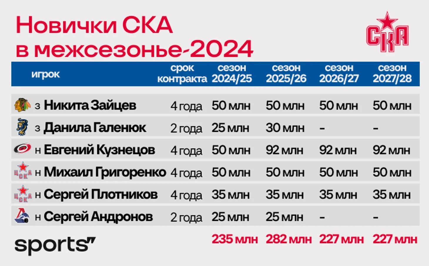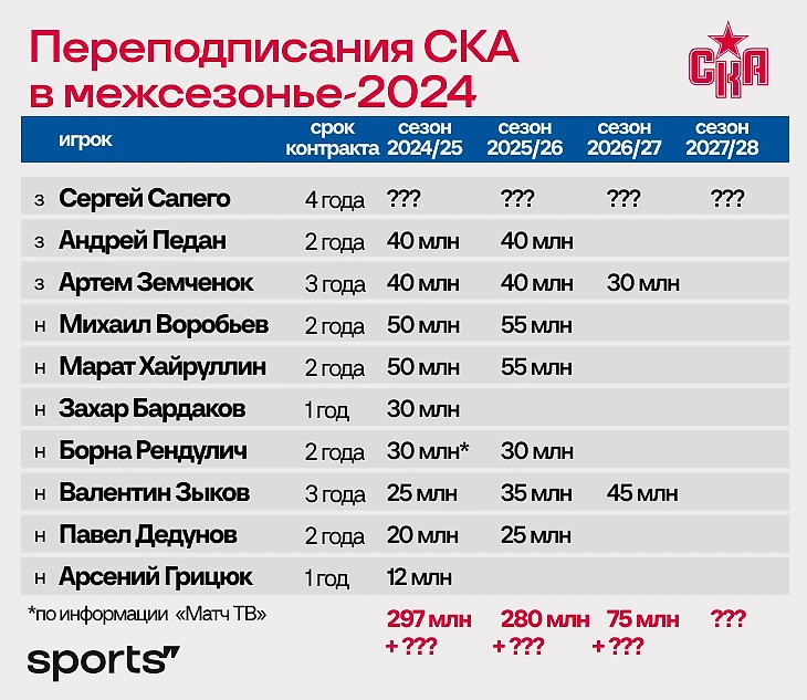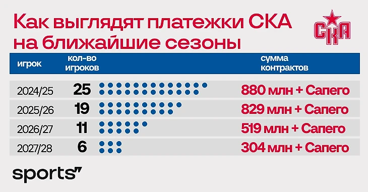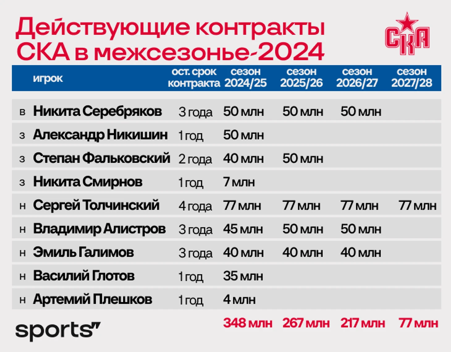 Помните про плохое или нарочито плохое долгосрочное планирование СКА? Взгляните на таблицу контрактов команды на ближайшие четыре сезона: платежка на сезон-2025/26 практически забита уже сейчас – во многом из-за контракта Кузнецова.
