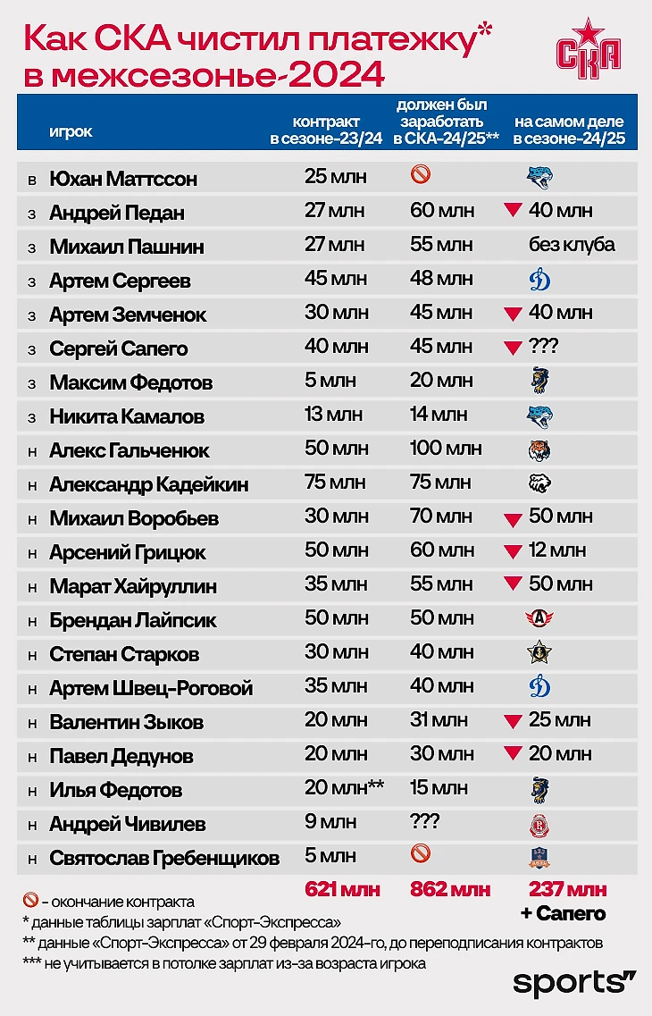 ● Причем СКА действовал аккуратно, чтобы расставание не влияло под потолок: если братья Федотовы ушли по обмену, то, например, Лайпсик, Кадейкин, Пашнин, Сергеев и Швец-Роговой были на контрактах. И расторгнув их их в последний день апреля, СКА избавил себя от лишней нагрузки в платежке. Повремени они один день – до 1 мая – вся компенсация за расторжение контракта ушла бы под потолок клуба.
