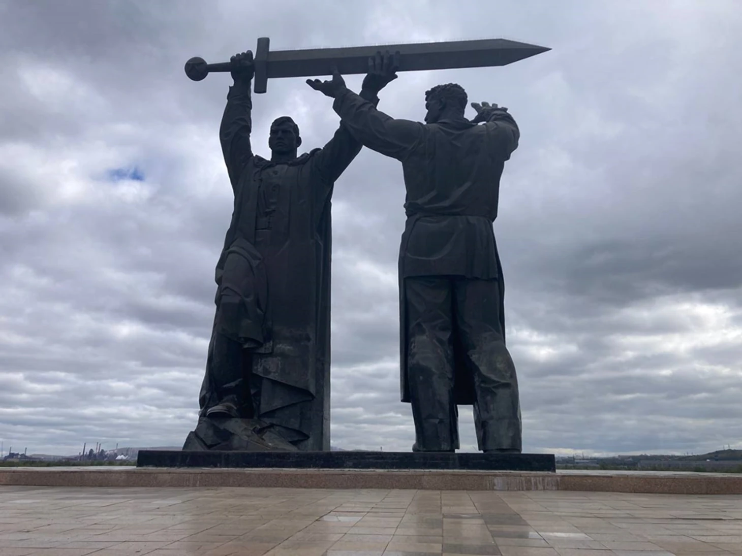 А рядом со второй находится огромный монумент «Тыл – фронту». С одной стороны – военный, с другой – рабочий. Причем их расположение неслучайно: рабочий смотрит на восток, в сторону комбината; воин – на запад, где в то время был враг.