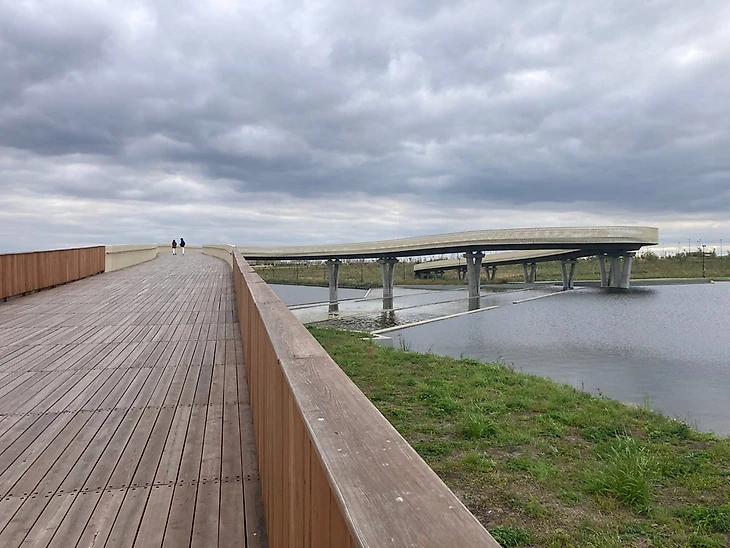 Жемчужина парка – 400-метровый извивающийся мост. Формой напоминает «Зарядье», только с желтой, а не с белой подсветкой в ночи.