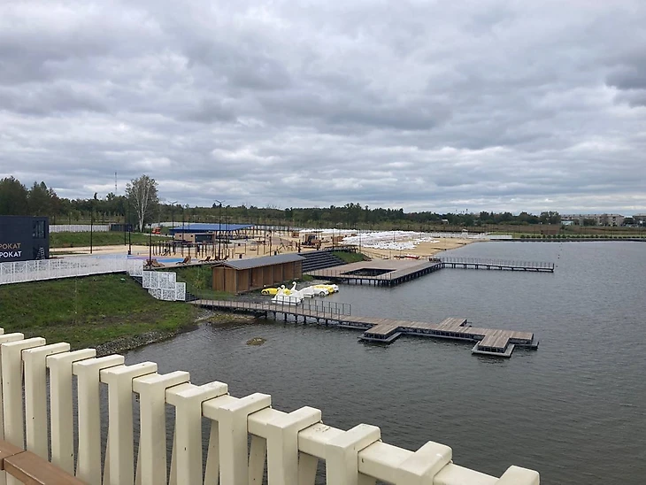 Готовы и еще несколько объектов: светомузыкальный фонтан, веревочный городок, пляж, детские площадки, фудкорт. Зимой работает горнолыжный спуск.
