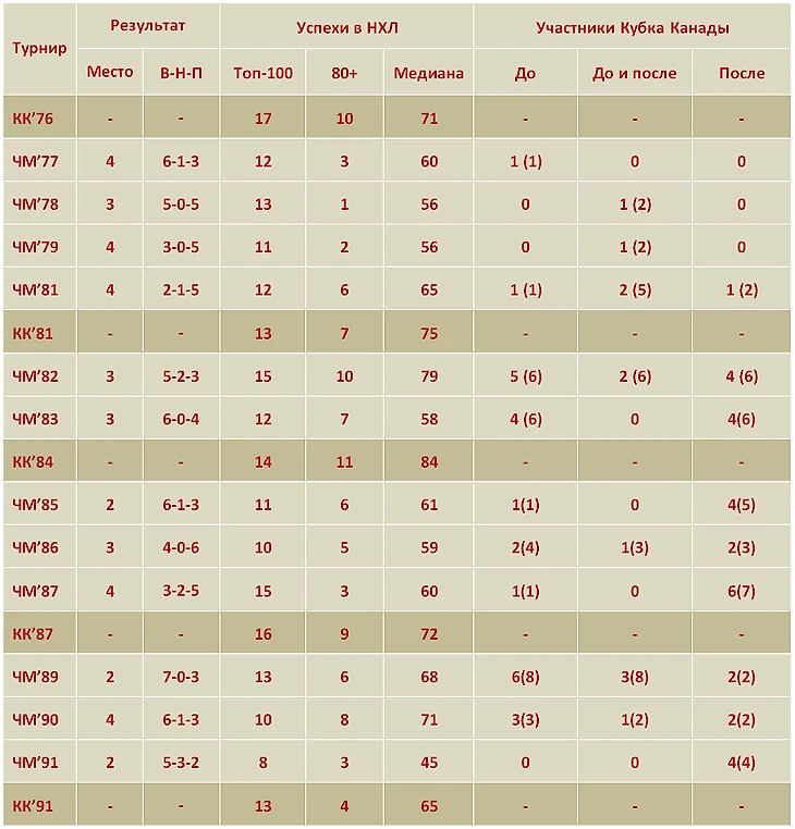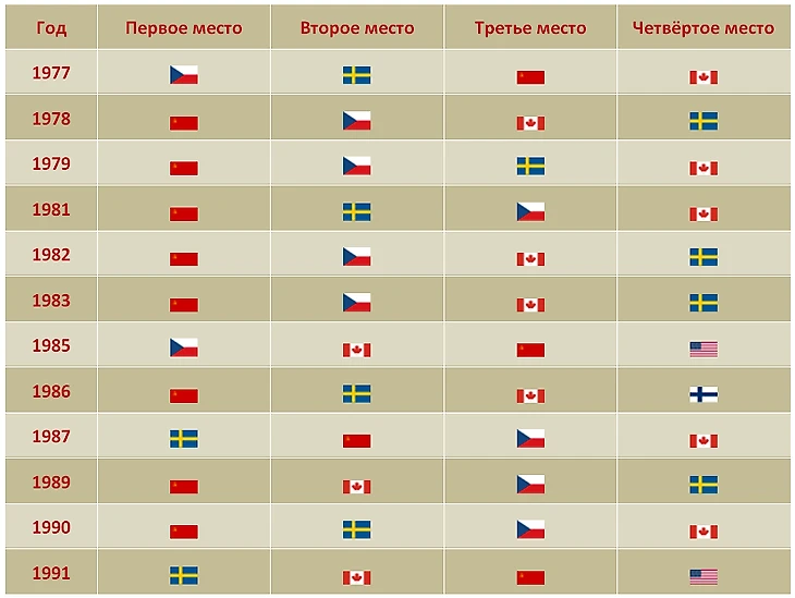 Суммировать результаты можно следующим образом. Сборная СССР оставалась доминирующей силой, но доминирование не было безусловным: советские хоккеисты выиграли две трети турниров, восемь из двенадцати. Сборные Швеции и ЧССР взяли по два титула, а вот канадцам это оказалось не под силу. С другой стороны, канадцы ни разу не оказывались за пределами четверки, в то время как со шведами это случилось однажды (1985), а с чехами и словаками – дважды (1986, 1991). Именно этот примечательный факт подарил нам подзаголовок.