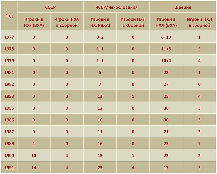Многим, думаю, кажется, что проблема «отъезда лучших в НХЛ» родом из девяностых. Для России это верно. Чехословакия столкнулась с этой проблемой в середине восьмидесятых, а вот шведы – уже в середине семидесятых. Иллюстрация – в приведенной ниже таблице.