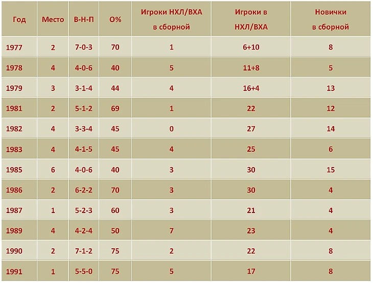 Ниже мы займемся их поиском. Рассмотрим результаты Канады на ЧМ в 1977-1991 гг. – в период, когда на турнире были одновременно и сборная СССР, и «профессионалы». Попробуем оценить силу состава канадских команд. И обсудим возможные причины того, почему канадцы играли так, как играли – и почему они не смогли выиграть чемпионат мира в то время.