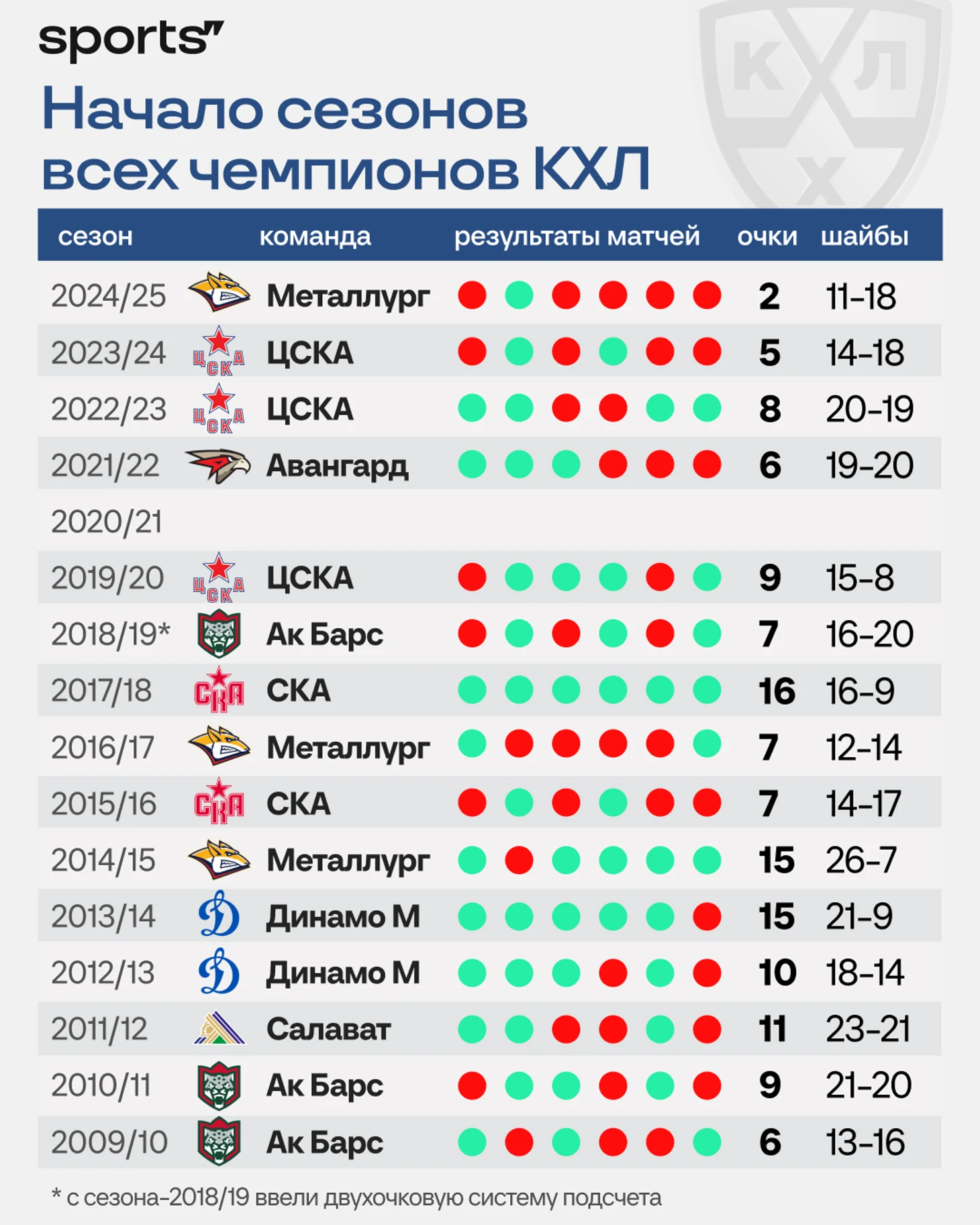 До сезона-2018/19 в КХЛ существовала трехочковая система подсчета. С ней «Металлург» уже выдавал плохой старт в постчемпионском сезоне-2016/17 – две победы в основное время и одно поражение по буллитам. Если же текущий результат «Металлурга» мы переведем на трехочковую систему, то получим те же 2 балла за победу в овертайме.