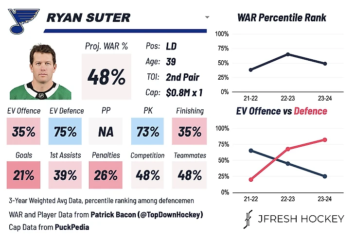 Подписание Сутера и выглядит несколько странным. Райан старый и медленный, хотя и способен проводить по 82 игры за сезон. Последний раз он пропускал игры в сезоне 2017-18, когда еще был игроком «Миннесоты». Вероятно, это страховка на тот случай, если не пойдет игра у тех же Перуновича, Броберга и Джозефа.