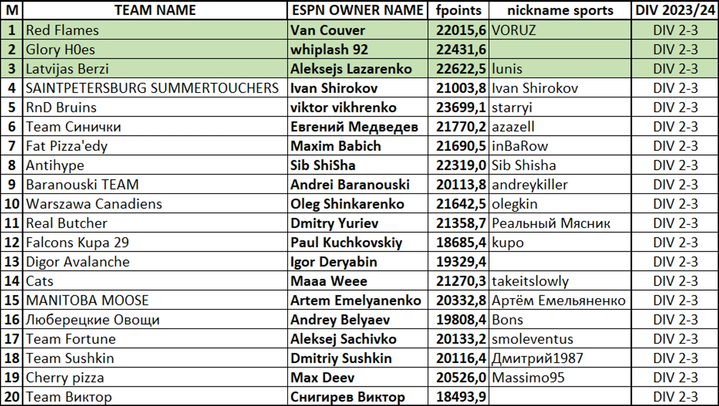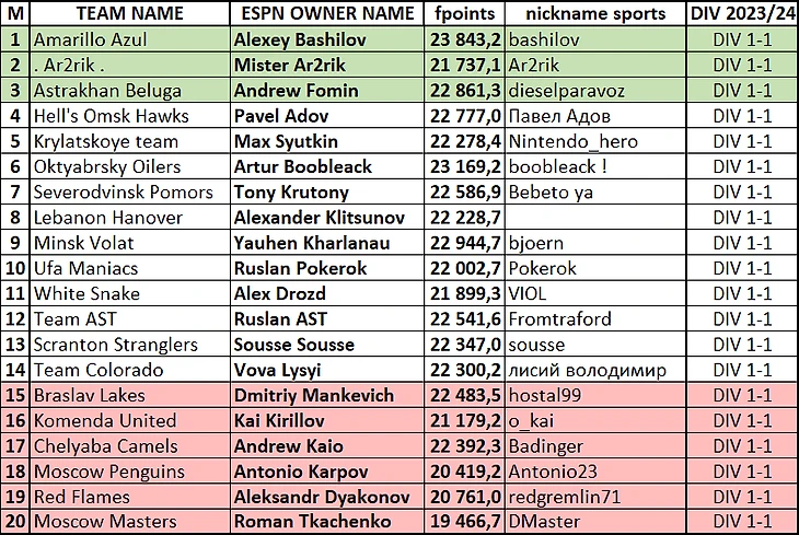 * в таблицах зеленая зона - поднялись в дивизион выше, красная - опустились на дивизион ниже