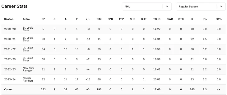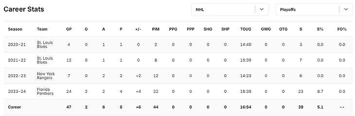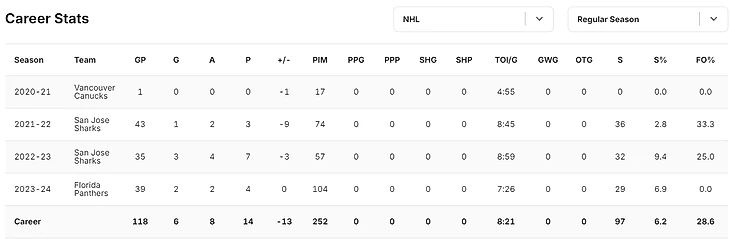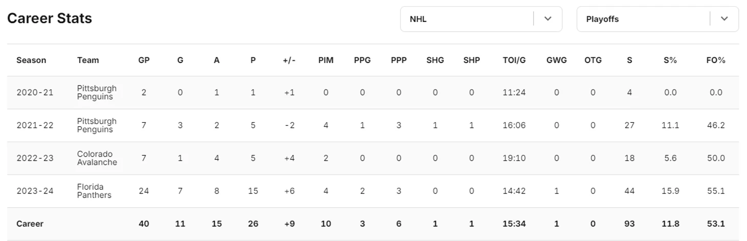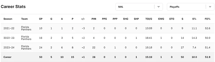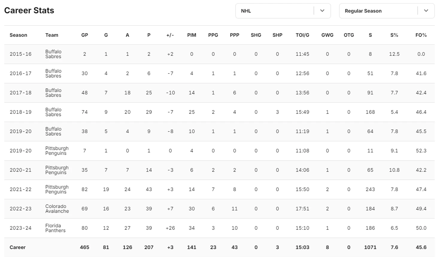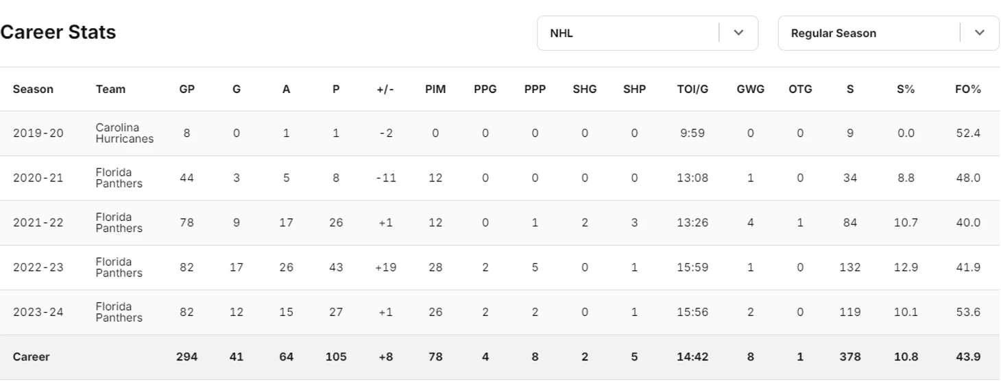 Прошедший сезон стал стартом четырехлетнего контракта для игрока «Пантерз». И вот что мне удалось выявить из статистики сезона 2023/2024 (решил копнуть поглубже, но такие раскопки отнимают много времени и сил, поэтому это будет разовой акцией, уж больно захотелось разобрать именно этого игрока).
