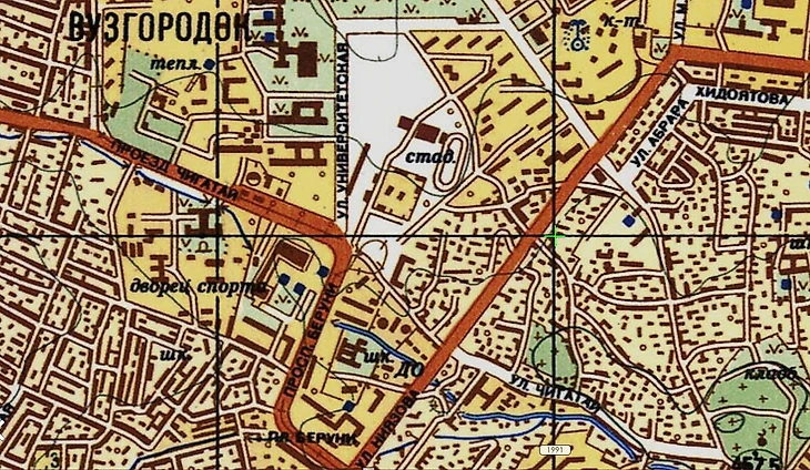1991 год. Фрагмент карты Ташкента (retromap.ru). Учебно-тренировочный каток там, где буквы «т» и «а» в слове «спорта»