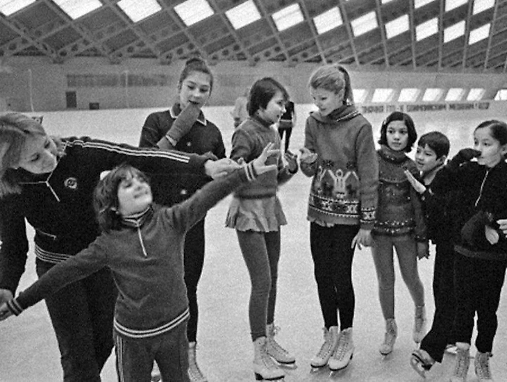 Февраль 1983 года. Ташкент. Центральный зал спорта «Юбилейный». Учебно-тренировочный каток. Марина Никитюк проводит занятия с юными фигуристами (фото Фархада Курбанбаева)