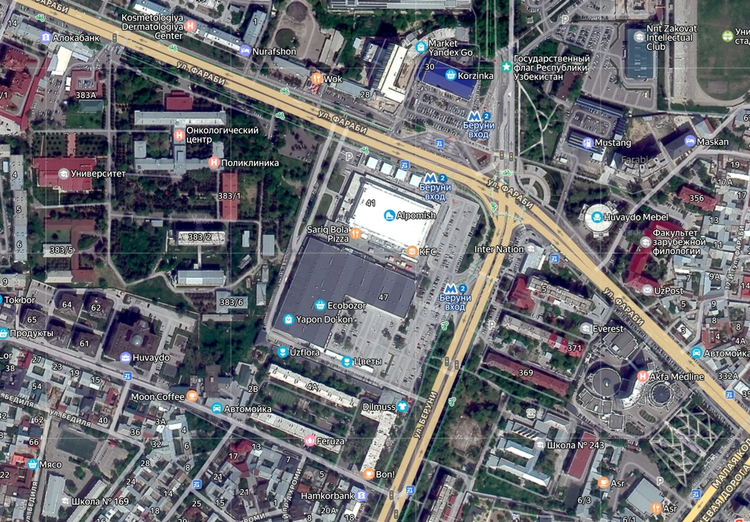 Наши дни. Ташкент. Дворец спорта «Алпомыш» и рынок «Экобазар» на спутниковом фотоснимке (yandex.ru/maps)