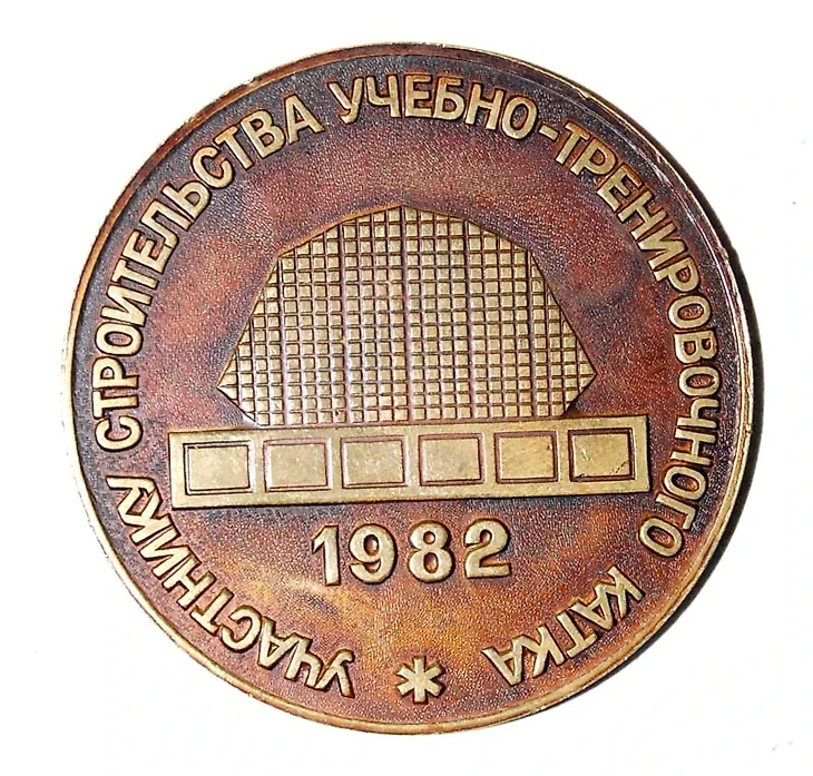 1982 год. Одна из сторон памятного жетона, вручавшегося участникам строительства ташкентского учебно-тренировочного катка