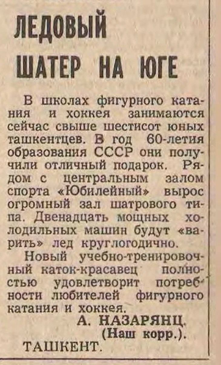 «Первые тренировки состоялись на новом крытом катке, сооруженном и Ташкенте. Сверкающий лед опробовали и любители фигурного катании, и хоккеисты.