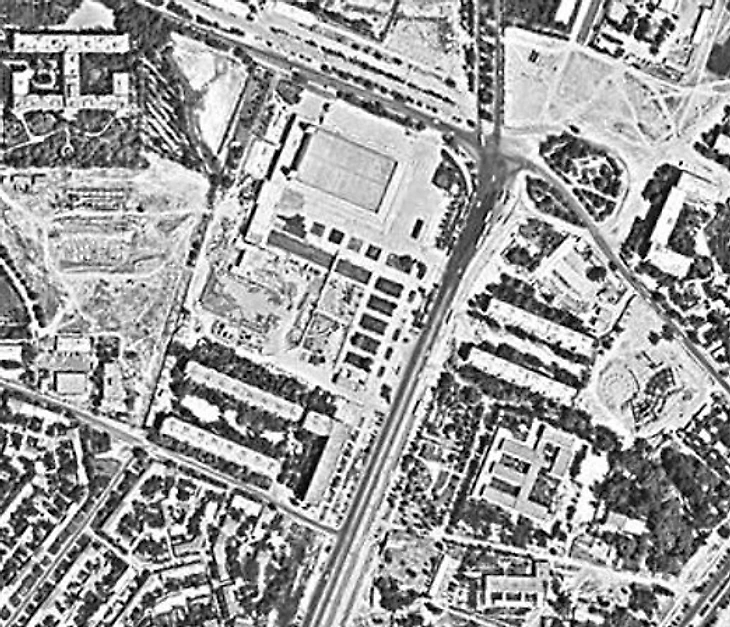 1980 года. Ташкент. Угол проспекта Беруни и проезда Чигатай. Центральный зал спорта «Юбилейный». Тренировочный каток еще не построен (аэрофотосъемка / retromap.ru)