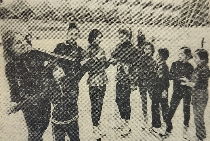 Февраль 1983 года. Ташкент. Центральный зал спорта «Юбилейный». Учебно-тренировочный каток. Марина Никитюк (серебряный призер чемпионата мира 1980 года среди юниоров в парном катании вместе с Рашидом Кадыркаевым; бронзовая медалистка V Зимней Спартакиады народов СССР в 1982 году с тем же партнером) проводит занятия с юными фигуристами (фото Фархада Курбанбаева из газеты «Физкультурник Узбекистана» № 15 от 6 февраля 1983 года)