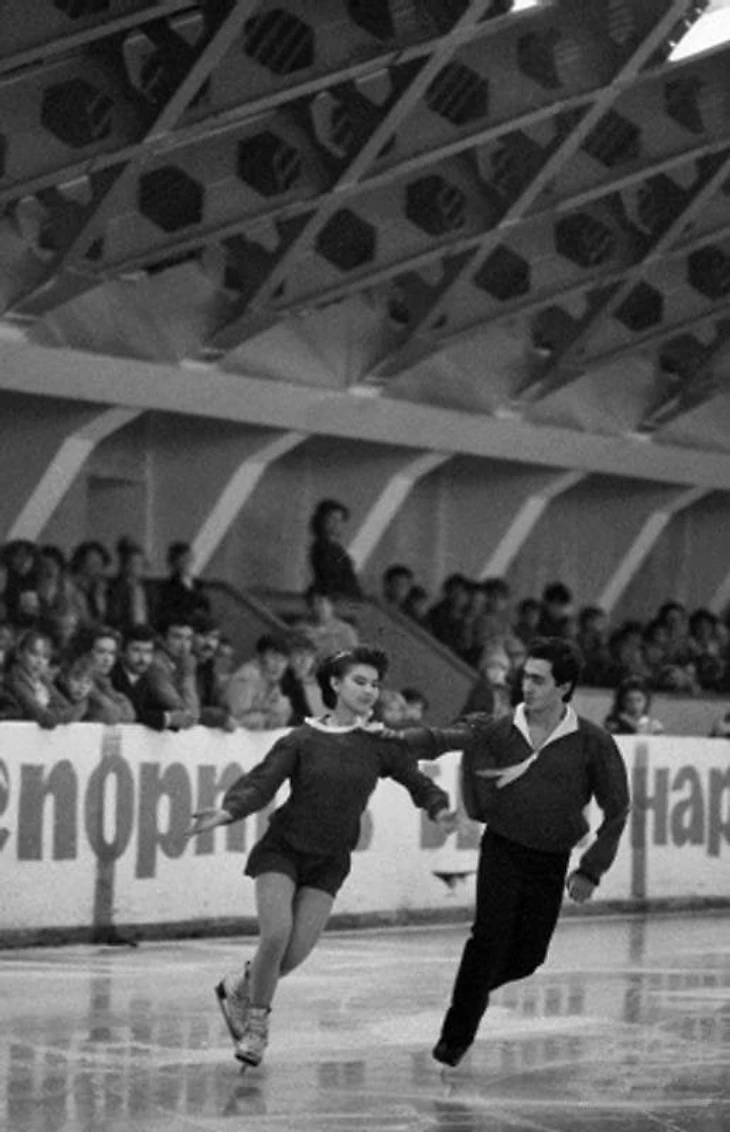 Середина 1980-х. Ташкент. Центральный зал спорта «Юбилейный». Учебно-тренировочный каток. Соревнования по фигурному катанию. Выступают ташкентские спортсмены Ружена Асанова и Муслим Саттаров - будущие победители Открытого чемпионата Ташкента 1988 года в танцах на льду (фото В. Миленького)