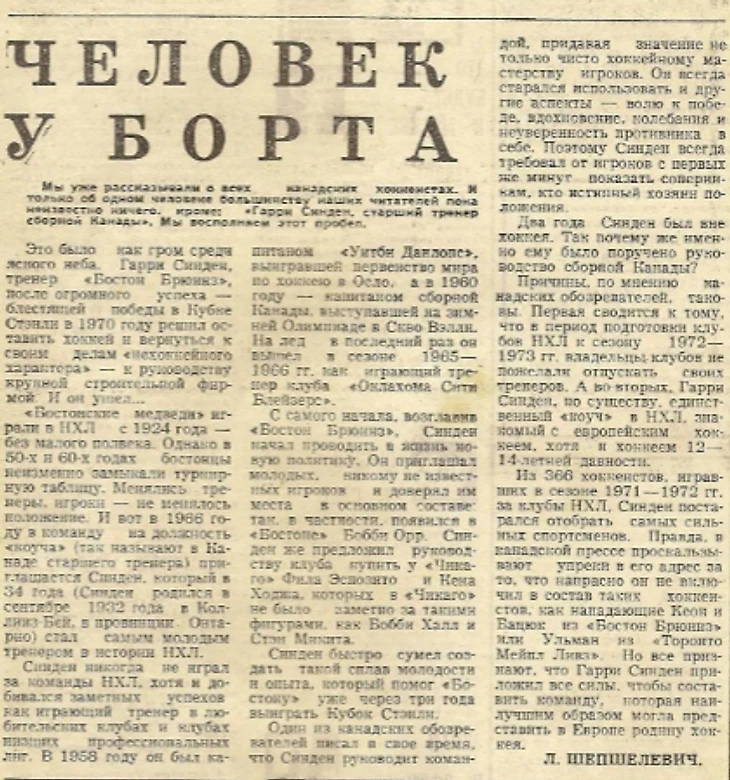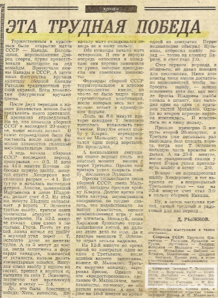 Советская пресса разносит нас в пух и прах. Гарри был, наверно, очень расстроен (можно ли его осуждать?) и потому после игры не явился на пресс-конференцию. ТАСС по этому поводу пишет: «Трудно объяснить, почему руководитель команды канадских профессионалов не присутствовал на пресс-конференции. Один канадский журналист высказал предположение, что Синден не мог оставить своих игроков одних. Оставшись в одиночестве, профессиональные спортсмены могут впасть в депрессию, и тогда судьба остальных матчей будет решена. Поэтому Синден немедленно приступил к психотерапии, считая задачу сохранения морально-волевых кондиций команды важнее, чем вежливость по отношению к репортерам».