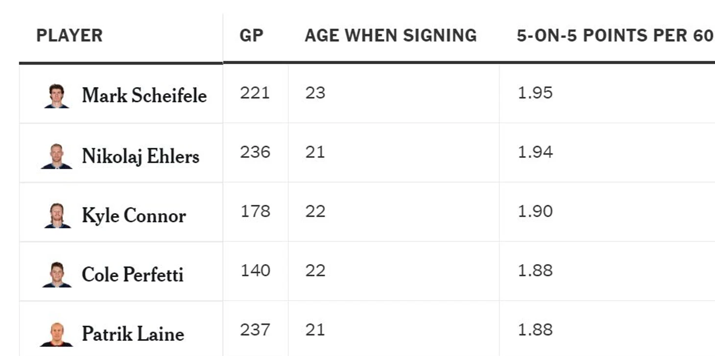 Если брать его результативность среди всех нападающих в истории «Джетс», показанную перед заключением второго контракта в карьере, то он смотрится вполне солидно, совсем немного уступая Шайфли, Коннору и Элерсу.