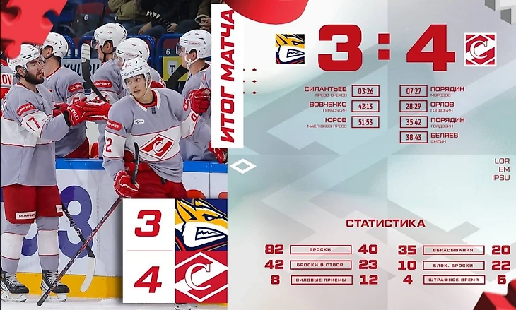 В Магнитогорске на стадионе «Арена-Металлург» прошёл матч регулярного чемпионата Континентальной хоккейной лиги между «Металлургом» и «Спартаком». Победу одержали красно-белые со счётом 4:3.
