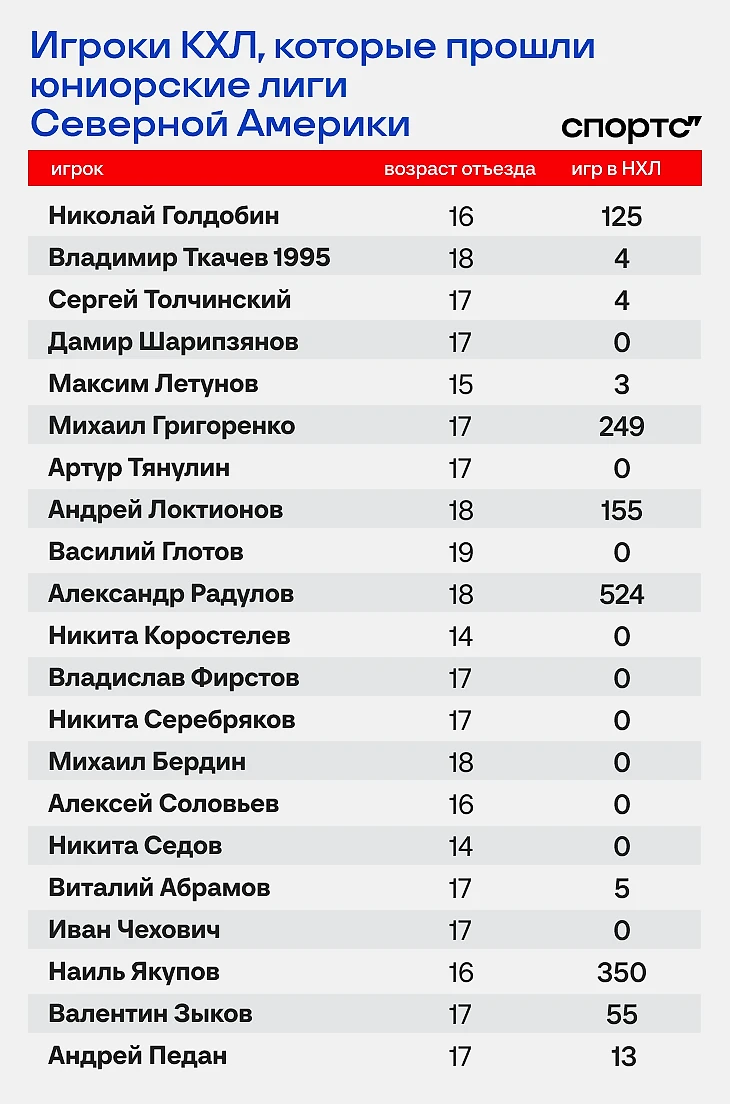 Также уехали именно перед драфтом его ровесники Сергей Алхимов, Олег Зайцев (оба – «Динамо»), Егор Сердюк (Омск), Михаил Абрамов, Матвей Гуськов, Егор Арбузов (все – ЦСКА), Артемий Князев (Казань), Ярослав Лихачев (Ярославль). Все – игроки сборной, элита своего возраста. Все уже вернулись в Россию, некоторые даже неплохо играют в КХЛ, но глобально итог неутешительный.