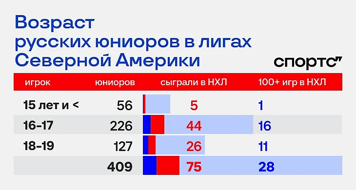 Как видим, поток стал реально устрашающим, когда в России уже появилась не только КХЛ, но и настоящая молодежная лига, какой раньше не было. Казалось бы, вот сколько возможностей: три лиги (плюс ВХЛ), много команд – играй, развивайся дома. Но нет, в 2010-х повалили за океан просто толпами. И есть ощущение, что на этом отрезке мы потеряли огромное количество талантов, что привело к тому, что нам просто некого было бы везти на Олимпиаду-2026. Будем проверять его постепенно – от самых юных «релокантов» к более взрослым, заодно проследим зависимость от возраста отъезда.