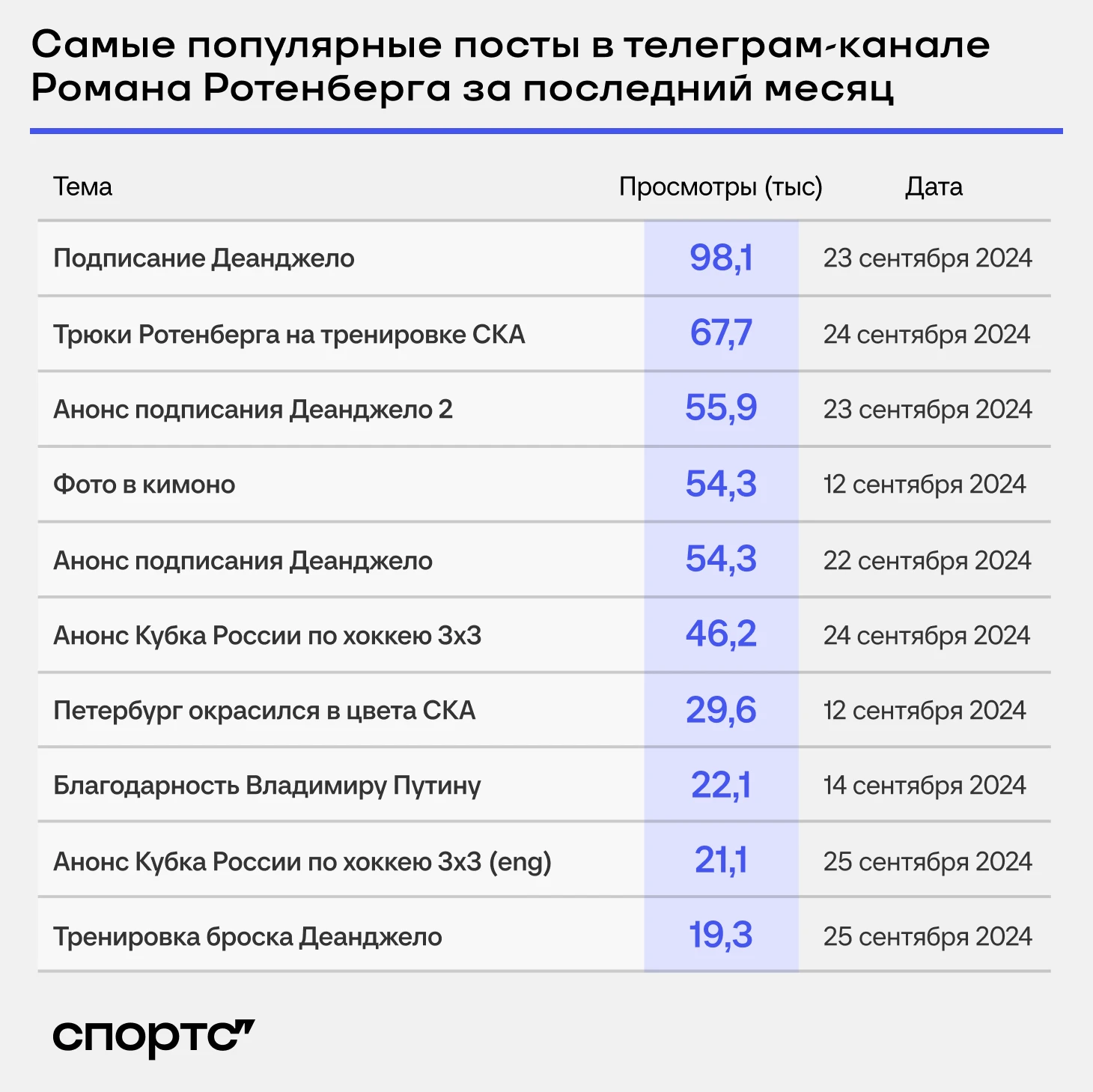 Всего за последнюю неделю Роман Ротенберг опубликовал или репостнул в канал 12 сообщений. В среднем они набирали 10-15 тысяч просмотров, хотя пост с поздравлением Сергея Бобровского не дотянул даже до этого. Резкий скачок случился как раз одновременно с переходом в СКА Энтони Деанджело: пост о «невероятном приключении итальянца в России» собрал рекордные 98 тысяч просмотров, 1100 реакций (большинство из которых средний палец) и 227 комментариев. Это самая популярная публикация у Ротенберга.